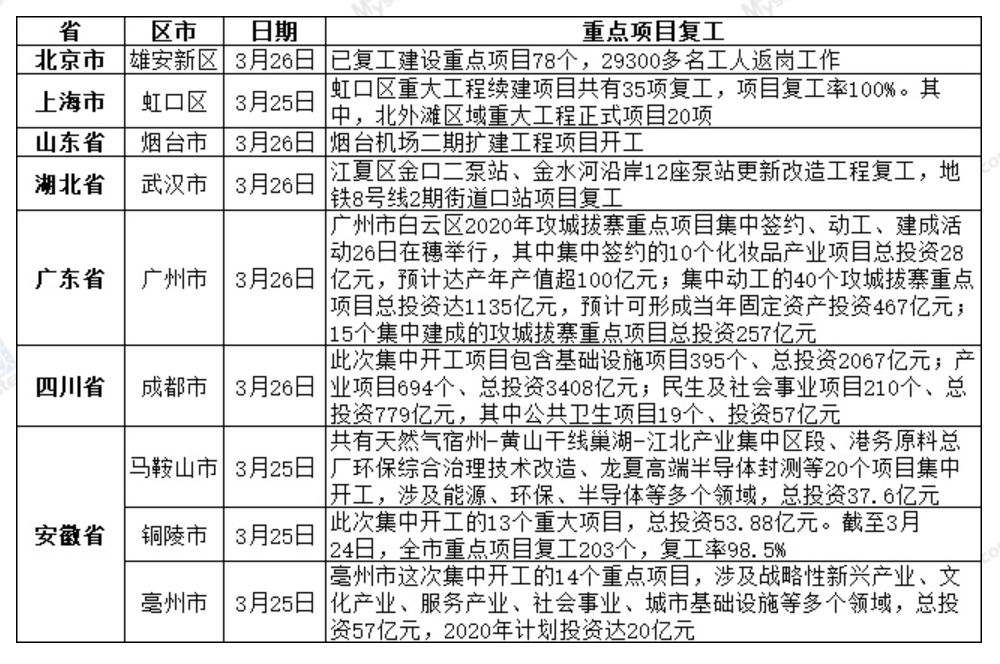 Mysteel統(tǒng)計(jì)數(shù)據(jù)顯示,截至3月26日,27省市規(guī)模以上工業(yè)企業(yè)復(fù)工率超過(guò)90%,江蘇、江西、湖南、重慶、新疆等省份人員返崗率超過(guò)90%。各地重大項(xiàng)目也陸續(xù)開(kāi)工。