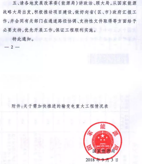 9月7日獲悉,國(guó)家能源局印發(fā)《關(guān)于加快推進(jìn)一批輸變電重點(diǎn)工程規(guī)劃建設(shè)工作的通知》國(guó)能發(fā)電力〔2018〕70號(hào),《通知》指出,為加大基礎(chǔ)設(shè)施領(lǐng)域補(bǔ)短板力度,發(fā)揮重點(diǎn)電網(wǎng)工程在優(yōu)化投資結(jié)構(gòu)、清潔能源消納、電力精準(zhǔn)扶貧等方面的重要作用,加快推進(jìn)青海至河南特高壓直流、白鶴灘至江蘇、白鶴灘至浙江特高壓直流等9項(xiàng)重點(diǎn)輸變電工程建設(shè),合計(jì)輸電能力5700萬(wàn)千瓦(工程見(jiàn)附件)。